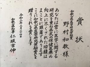 野村和教氏は、平成13年に和歌山県立医科大学大学院を修了し、県内外の病院で勤務された後、平成19年に現在の社会医療法人スミヤ角谷整形外科病院に赴任され、県内の地域医療に携わるとともに、医療現場での臨床研究に努められてきました。