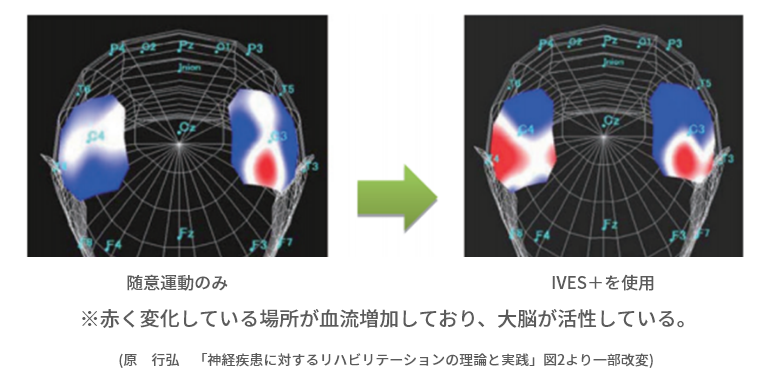 リアルタイムで電気刺激のアシストが行われ、できない運動の補助をしてくれるだけでなく、それにより損傷した大脳半球の回復を促す効果があります。