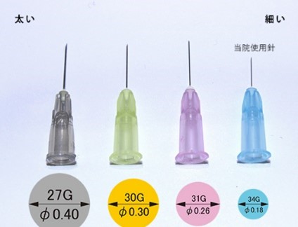 一般に成人の皮膚表面には、1mm2の範囲に10~20個の痛点が分布しており、痛点を避けて穿刺することで痛みの感覚を低減することができます。34Gと非常に細い為、痛点にあたる確率を減らして穿刺することが可能となります。